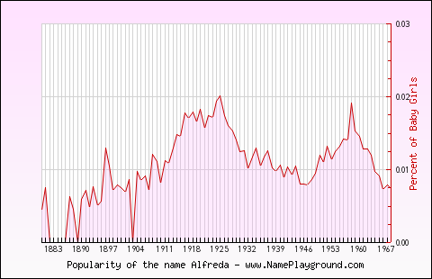 Popularity of the name Alfreda for GirlsFirst Year in the Top 1000: 1880 (earliest year for which we have data) Last Year in the Top 1000: 1968 Average Age: 85.10 Highest Percentage: 0.020% in 1925 Best Rank: #456 (in 1925) Represented in the Top 1000 names in: 82 of 127 years (64.57%) Total* Female Population in Top 1000: 10077 Percentage Of Babies Named AlfredaNote: Only names in the Top 1000 for each year are represented. [source] Values are normalized for boys and girls to compare trends (vertical scales differ for boys and girls).  Age Distribution of AlfredaAbout these totals.Female Population under 60: 497 (4.93%) Female Population under 50: 0 (0.00%) Female Population under 40: 0 (0.00%) Female Population under 30: 0 (0.00%) Female Population under 20: 0 (0.00%) Names Similar to AlfredaSimilar Male Names