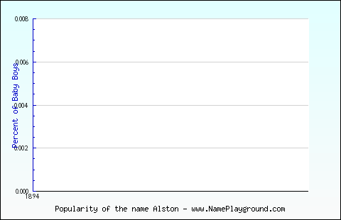 Percentage Of Babies Named AlstonNote: Only names in the Top 1000 for each year are represented. [source] Values are normalized for boys and girls to compare trends (vertical scales differ for boys and girls).  Age Distribution of AlstonAbout these totals.Male Population under 60: 0 (0.00%) Male Population under 50: 0 (0.00%) Male Population under 40: 0 (0.00%) Male Population under 30: 0 (0.00%) Male Population under 20: 0 (0.00%) Male Population under 10: 0 (0.00%) Names Similar to AlstonSimilar Male Names