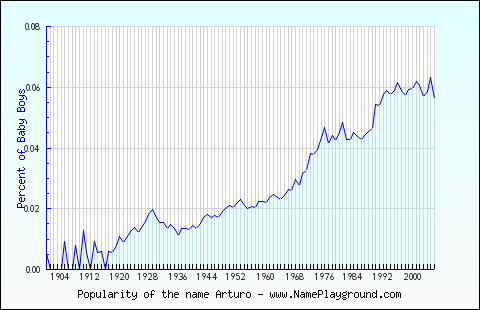Popularity of the name Arturo for BoysFirst Year in the Top 1000: 1900 Last Year in the Top 1000: 2006 (latest year for which we have data) Average Age: 47.59 Highest Percentage: 0.063% in 2005 Best Rank: #259 (in 1990) Represented in the Top 1000 names in: 98 of 127 years (77.17%) Total* Male Population in Top 1000: 45936 Popularity of the name Arturo for Girls— None. —