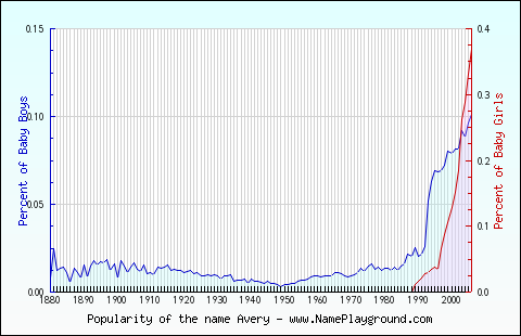 Popularity of the name Avery for BoysFirst Year in the Top 1000: 1880 (earliest year for which we have data) Last Year in the Top 1000: 2006 (latest year for which we have data) Average Age: 41.27 Highest Percentage: 0.101% in 2006 Best Rank: #212 (in 2006) Represented in the Top 1000 names in: 127 of 127 years (100.00%) Worst Rank: #911 (in 1949) Total* Male Population in Top 1000: 31961 Popularity of the name Avery for GirlsFirst Year in the Top 1000: 1989 Last Year in the Top 1000: 2006 (latest year for which we have data) Average Age: 23.07 Highest Percentage: 0.369% in 2006 Represented in the Top 1000 names in: 18 of 127 years (14.17%) Total* Female Population in Top 1000: 30873 Percentage Of Babies Named AveryNote: Only names in the Top 1000 for each year are represented. [source] Values are normalized for boys and girls to compare trends (vertical scales differ for boys and girls).  Age Distribution of AveryAbout these totals.Male Population under 60: 25807 (41.07%) Male Population under 50: 24042 (38.26%) Male Population under 40: 21827 (34.74%) Male Population under 30: 16784 (26.71%) Male Population under 20: 3406 (5.42%) Male Population under 10: 0 (0.00%) Female Population under 60: 30873 (49.13%) Female Population under 50: 30873 (49.13%) Female Population under 40: 30873 (49.13%) Female Population under 30: 28703 (45.68%) Female Population under 20: 9780 (15.56%) Names Similar to AverySimilar Male Names