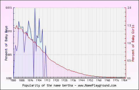 Popularity of the name Bertha for BoysFirst Year in the Top 1000: 1881 Last Year in the Top 1000: 1910 Average Age: 129.54 Highest Percentage: 0.015% in 1900 Best Rank: #496 (in 1900) Represented in the Top 1000 names in: 27 of 127 years (21.26%) Total* Male Population in Top 1000: 295 Popularity of the name Bertha for GirlsFirst Year in the Top 1000: 1880 (earliest year for which we have data) Last Year in the Top 1000: 1985 Average Age: 105.72 Highest Percentage: 1.500% in 1883 Represented in the Top 1000 names in: 106 of 127 years (83.46%) Total* Female Population in Top 1000: 204541 Percentage Of Babies Named BerthaNote: Only names in the Top 1000 for each year are represented. [source] Values are normalized for boys and girls to compare trends (vertical scales differ for boys and girls).  Age Distribution of BerthaAbout these totals.Male Population under 60: 0 (0.00%) Male Population under 50: 0 (0.00%) Male Population under 40: 0 (0.00%) Male Population under 30: 0 (0.00%) Male Population under 20: 0 (0.00%) Male Population under 10: 0 (0.00%) Female Population under 60: 6083 (2.97%) Female Population under 50: 2185 (1.07%) Female Population under 40: 160 (0.08%) Female Population under 30: 0 (0.00%) Female Population under 20: 0 (0.00%) Names Similar to BerthaSimilar Male Names