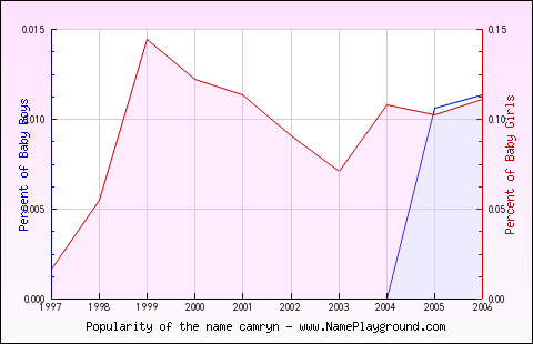 Popularity of the name Camryn for BoysFirst Year in the Top 1000: 2005 Last Year in the Top 1000: 2006 (latest year for which we have data) Average Age: 19.48 Highest Percentage: 0.011% in 2006 Best Rank: #929 (in 2006) Represented in the Top 1000 names in: 2 of 127 years (1.57%) Total* Male Population in Top 1000: 378 Popularity of the name Camryn for GirlsFirst Year in the Top 1000: 1997 Last Year in the Top 1000: 2006 (latest year for which we have data) Average Age: 23.08 Highest Percentage: 0.145% in 1999 Best Rank: #158 (in 1999) Represented in the Top 1000 names in: 10 of 127 years (7.87%) Total* Female Population in Top 1000: 13153 Percentage Of Babies Named CamrynNote: Only names in the Top 1000 for each year are represented. [source] Values are normalized for boys and girls to compare trends (vertical scales differ for boys and girls).  Age Distribution of CamrynAbout these totals.Male Population under 60: 378 (2.79%) Male Population under 50: 378 (2.79%) Male Population under 40: 378 (2.79%) Male Population under 30: 378 (2.79%) Male Population under 20: 378 (2.79%) Male Population under 10: 0 (0.00%) Female Population under 60: 13153 (97.21%) Female Population under 50: 13153 (97.21%) Female Population under 40: 13153 (97.21%) Female Population under 30: 13153 (97.21%) Female Population under 20: 2981 (22.03%) Names Similar to CamrynSimilar Male Names