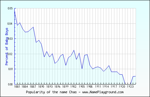 Popularity of the name Chas for BoysFirst Year in the Top 1000: 1880 (earliest year for which we have data) Last Year in the Top 1000: 1925 Average Age: 120.99 Highest Percentage: 0.048% in 1880 Best Rank: #222 (in 1880) Represented in the Top 1000 names in: 43 of 127 years (33.86%) Total* Male Population in Top 1000: 1572 Popularity of the name Chas for Girls— None. —