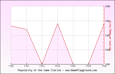 Popularity of the name Clarine for GirlsFirst Year in the Top 1000: 1920 Last Year in the Top 1000: 1926 Average Age: 102.42 Highest Percentage: 0.006% in 1926 Best Rank: #916 (in 1923) Represented in the Top 1000 names in: 4 of 127 years (3.15%) Total* Female Population in Top 1000: 243 Percentage Of Babies Named ClarineNote: Only names in the Top 1000 for each year are represented. [source] Values are normalized for boys and girls to compare trends (vertical scales differ for boys and girls).  Age Distribution of ClarineAbout these totals.Female Population under 60: 0 (0.00%) Female Population under 50: 0 (0.00%) Female Population under 40: 0 (0.00%) Female Population under 30: 0 (0.00%) Female Population under 20: 0 (0.00%) Names Similar to ClarineSimilar Male Names