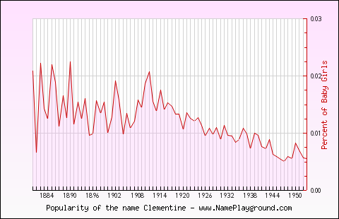 Popularity of the name Clementine for GirlsFirst Year in the Top 1000: 1880 (earliest year for which we have data) Last Year in the Top 1000: 1953 Average Age: 99.79 Highest Percentage: 0.022% in 1890 Best Rank: #363 (in 1882) Represented in the Top 1000 names in: 74 of 127 years (58.27%) Total* Female Population in Top 1000: 5672 Percentage Of Babies Named ClementineNote: Only names in the Top 1000 for each year are represented. [source] Values are normalized for boys and girls to compare trends (vertical scales differ for boys and girls).  Age Distribution of ClementineAbout these totals.Female Population under 60: 0 (0.00%) Female Population under 50: 0 (0.00%) Female Population under 40: 0 (0.00%) Female Population under 30: 0 (0.00%) Female Population under 20: 0 (0.00%) Names Similar to ClementineSimilar Male Names