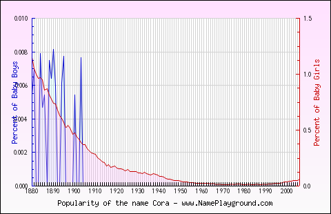 Popularity of the name Cora for BoysFirst Year in the Top 1000: 1880 (earliest year for which we have data) Last Year in the Top 1000: 1903 Average Age: 134.74 Highest Percentage: 0.008% in 1890 Best Rank: #673 (in 1884) Represented in the Top 1000 names in: 13 of 127 years (10.24%) Total* Male Population in Top 1000: 97 Popularity of the name Cora for GirlsFirst Year in the Top 1000: 1880 (earliest year for which we have data) Last Year in the Top 1000: 2006 (latest year for which we have data) Average Age: 98.59 Highest Percentage: 1.145% in 1880 Represented in the Top 1000 names in: 127 of 127 years (100.00%) Worst Rank: #875 (in 1988) Total* Female Population in Top 1000: 108142 Percentage Of Babies Named CoraNote: Only names in the Top 1000 for each year are represented. [source] Values are normalized for boys and girls to compare trends (vertical scales differ for boys and girls).  Age Distribution of CoraAbout these totals.Male Population under 60: 0 (0.00%) Male Population under 50: 0 (0.00%) Male Population under 40: 0 (0.00%) Male Population under 30: 0 (0.00%) Male Population under 20: 0 (0.00%) Male Population under 10: 0 (0.00%) Female Population under 60: 13609 (12.57%) Female Population under 50: 11200 (10.35%) Female Population under 40: 9053 (8.36%) Female Population under 30: 6599 (6.10%) Female Population under 20: 1496 (1.38%) Names Similar to CoraSimilar Male Names