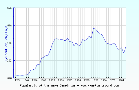 Popularity of the name Demetrius for BoysFirst Year in the Top 1000: 1954 Last Year in the Top 1000: 2006 (latest year for which we have data) Average Age: 39.20 Highest Percentage: 0.057% in 1991 Best Rank: #258 (in 1991) Represented in the Top 1000 names in: 53 of 127 years (41.73%) Total* Male Population in Top 1000: 29002 Popularity of the name Demetrius for Girls— None. —