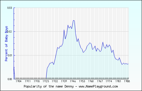 Popularity of the name Denny for BoysFirst Year in the Top 1000: 1900 Last Year in the Top 1000: 1989 Average Age: 67.48 Highest Percentage: 0.025% in 1946 Best Rank: #325 (in 1946) Represented in the Top 1000 names in: 65 of 127 years (51.18%) Total* Male Population in Top 1000: 12801 Popularity of the name Denny for Girls— None. —