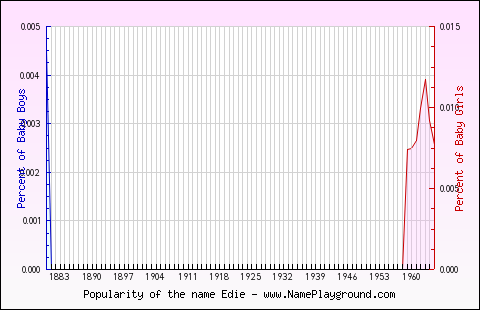 Popularity of the name Edie for BoysFirst Year in the Top 1000: 1880 (earliest year for which we have data) Last Year in the Top 1000: 1880 (earliest year for which we have data) Average Age: 145.00 Highest Percentage: 0.005% in 1880 Best Rank: #945 (in 1880) Represented in the Top 1000 names in: 1 of 127 years (0.79%) Total* Male Population in Top 1000: 5 Popularity of the name Edie for GirlsFirst Year in the Top 1000: 1959 Last Year in the Top 1000: 1965 Average Age: 62.95 Highest Percentage: 0.012% in 1963 Best Rank: #699 (in 1963) Represented in the Top 1000 names in: 7 of 127 years (5.51%) Total* Female Population in Top 1000: 1117 Percentage Of Babies Named EdieNote: Only names in the Top 1000 for each year are represented. [source] Values are normalized for boys and girls to compare trends (vertical scales differ for boys and girls).  Age Distribution of EdieAbout these totals.Male Population under 60: 0 (0.00%) Male Population under 50: 0 (0.00%) Male Population under 40: 0 (0.00%) Male Population under 30: 0 (0.00%) Male Population under 20: 0 (0.00%) Male Population under 10: 0 (0.00%) Female Population under 60: 127 (11.32%) Female Population under 50: 0 (0.00%) Female Population under 40: 0 (0.00%) Female Population under 30: 0 (0.00%) Female Population under 20: 0 (0.00%) Names Similar to EdieSimilar Male Names
