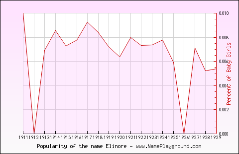 Popularity of the name Elinore for GirlsFirst Year in the Top 1000: 1911 Last Year in the Top 1000: 1929 Average Age: 104.57 Highest Percentage: 0.010% in 1911 Best Rank: #686 (in 1911) Represented in the Top 1000 names in: 17 of 127 years (13.39%) Total* Female Population in Top 1000: 1238 Percentage Of Babies Named ElinoreNote: Only names in the Top 1000 for each year are represented. [source] Values are normalized for boys and girls to compare trends (vertical scales differ for boys and girls).  Age Distribution of ElinoreAbout these totals.Female Population under 60: 0 (0.00%) Female Population under 50: 0 (0.00%) Female Population under 40: 0 (0.00%) Female Population under 30: 0 (0.00%) Female Population under 20: 0 (0.00%) Names Similar to ElinoreSimilar Male Names