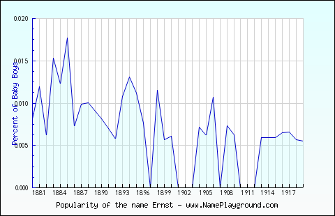 Popularity of the name Ernst for BoysFirst Year in the Top 1000: 1880 (earliest year for which we have data) Last Year in the Top 1000: 1919 Average Age: 119.28 Highest Percentage: 0.018% in 1885 Best Rank: #417 (in 1885) Represented in the Top 1000 names in: 32 of 127 years (25.20%) Total* Male Population in Top 1000: 603 Popularity of the name Ernst for Girls— None. —
