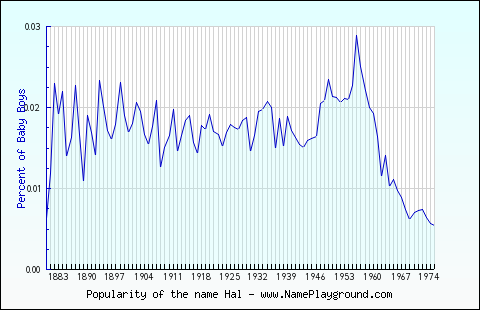 Popularity of the name Hal for BoysFirst Year in the Top 1000: 1880 (earliest year for which we have data) Last Year in the Top 1000: 1975 Average Age: 81.14 Highest Percentage: 0.029% in 1956 Best Rank: #306 (in 1956) Represented in the Top 1000 names in: 96 of 127 years (75.59%) Total* Male Population in Top 1000: 15184 Popularity of the name Hal for Girls— None. —