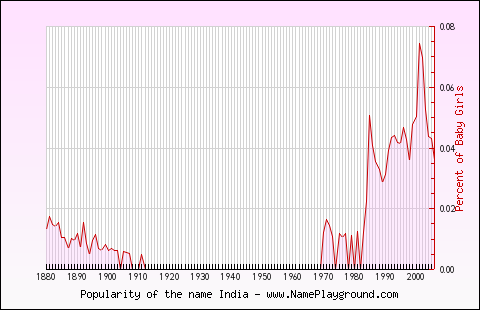 Popularity of the name India for GirlsFirst Year in the Top 1000: 1880 (earliest year for which we have data) Last Year in the Top 1000: 2006 (latest year for which we have data) Average Age: 34.37 Highest Percentage: 0.074% in 2001 Best Rank: #298 (in 2001) Represented in the Top 1000 names in: 61 of 127 years (48.03%) Total* Female Population in Top 1000: 16666 Percentage Of Babies Named IndiaNote: Only names in the Top 1000 for each year are represented. [source] Values are normalized for boys and girls to compare trends (vertical scales differ for boys and girls).  Age Distribution of IndiaAbout these totals.Female Population under 60: 16181 (97.09%) Female Population under 50: 15407 (92.45%) Female Population under 40: 14122 (84.74%) Female Population under 30: 8244 (49.47%) Female Population under 20: 1107 (6.64%) Names Similar to IndiaSimilar Male Names