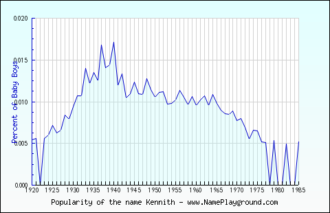Popularity of the name Kennith for BoysFirst Year in the Top 1000: 1920 Last Year in the Top 1000: 1985 Average Age: 72.92 Highest Percentage: 0.017% in 1940 Best Rank: #420 (in 1940) Represented in the Top 1000 names in: 60 of 127 years (47.24%) Total* Male Population in Top 1000: 8598 Popularity of the name Kennith for Girls— None. —