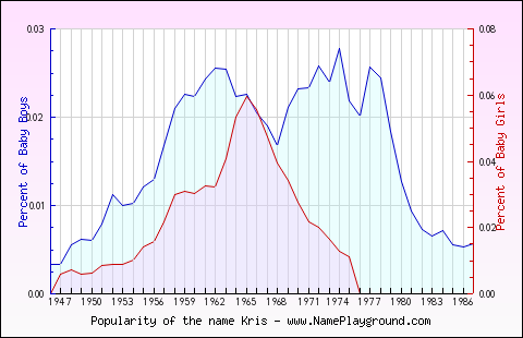 Popularity of the name Kris for BoysFirst Year in the Top 1000: 1946 Last Year in the Top 1000: 1987 Average Age: 58.42 Highest Percentage: 0.028% in 1974 Best Rank: #345 (in 1963) Represented in the Top 1000 names in: 42 of 127 years (33.07%) Total* Male Population in Top 1000: 11779 Popularity of the name Kris for GirlsFirst Year in the Top 1000: 1947 Last Year in the Top 1000: 1975 Average Age: 61.99 Highest Percentage: 0.060% in 1965 Best Rank: #277 (in 1965) Represented in the Top 1000 names in: 29 of 127 years (22.83%) Total* Female Population in Top 1000: 11911 Percentage Of Babies Named KrisNote: Only names in the Top 1000 for each year are represented. [source] Values are normalized for boys and girls to compare trends (vertical scales differ for boys and girls).  Age Distribution of KrisAbout these totals.Male Population under 60: 6427 (27.13%) Male Population under 50: 2713 (11.45%) Male Population under 40: 289 (1.22%) Male Population under 30: 0 (0.00%) Male Population under 20: 0 (0.00%) Male Population under 10: 0 (0.00%) Female Population under 60: 5251 (22.17%) Female Population under 50: 141 (0.60%) Female Population under 40: 0 (0.00%) Female Population under 30: 0 (0.00%) Female Population under 20: 0 (0.00%) Names Similar to KrisSimilar Male Names