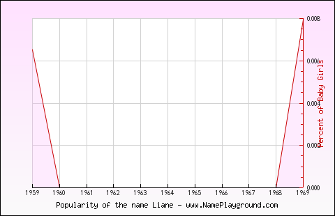 Popularity of the name Liane for GirlsFirst Year in the Top 1000: 1959 Last Year in the Top 1000: 1969 Average Age: 61.04 Highest Percentage: 0.008% in 1969 Best Rank: #942 (in 1959) Represented in the Top 1000 names in: 2 of 127 years (1.57%) Total* Female Population in Top 1000: 246 Percentage Of Babies Named LianeNote: Only names in the Top 1000 for each year are represented. [source] Values are normalized for boys and girls to compare trends (vertical scales differ for boys and girls).  Age Distribution of LianeAbout these totals.Female Population under 60: 122 (49.59%) Female Population under 50: 0 (0.00%) Female Population under 40: 0 (0.00%) Female Population under 30: 0 (0.00%) Female Population under 20: 0 (0.00%) Names Similar to LianeSimilar Male Names