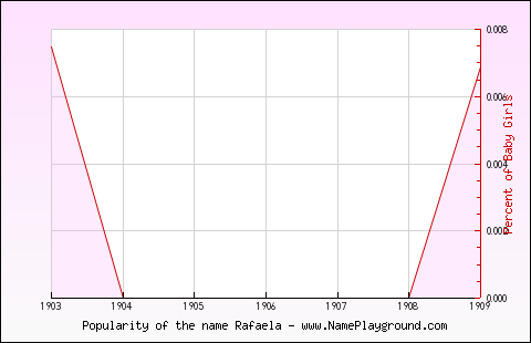 Popularity of the name Rafaela for GirlsFirst Year in the Top 1000: 1903 Last Year in the Top 1000: 1909 Average Age: 118.71 Highest Percentage: 0.007% in 1903 Best Rank: #808 (in 1903) Represented in the Top 1000 names in: 2 of 127 years (1.57%) Total* Female Population in Top 1000: 42 Percentage Of Babies Named RafaelaNote: Only names in the Top 1000 for each year are represented. [source] Values are normalized for boys and girls to compare trends (vertical scales differ for boys and girls).  Age Distribution of RafaelaAbout these totals.Female Population under 60: 0 (0.00%) Female Population under 50: 0 (0.00%) Female Population under 40: 0 (0.00%) Female Population under 30: 0 (0.00%) Female Population under 20: 0 (0.00%) Names Similar to RafaelaSimilar Male Names
