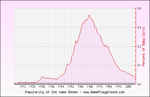 Popularity of the name Renee for GirlsFirst Year in the Top 1000: 1905 Last Year in the Top 1000: 2006 (latest year for which we have data) Average Age: 56.82 Highest Percentage: 0.365% in 1967 Represented in the Top 1000 names in: 100 of 127 years (78.74%) Total* Female Population in Top 1000: 180271 Percentage Of Babies Named ReneeNote: Only names in the Top 1000 for each year are represented. [source] Values are normalized for boys and girls to compare trends (vertical scales differ for boys and girls).  Age Distribution of ReneeAbout these totals.Female Population under 60: 104591 (58.02%) Female Population under 50: 55919 (31.02%) Female Population under 40: 25868 (14.35%) Female Population under 30: 9119 (5.06%) Female Population under 20: 1013 (0.56%) Names Similar to ReneeSimilar Male Names