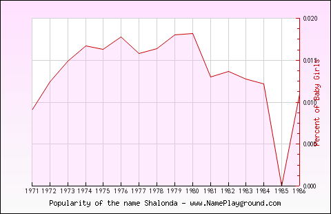Popularity of the name Shalonda for GirlsFirst Year in the Top 1000: 1971 Last Year in the Top 1000: 1986 Average Age: 46.89 Highest Percentage: 0.018% in 1980 Best Rank: #669 (in 1976) Represented in the Top 1000 names in: 15 of 127 years (11.81%) Total* Female Population in Top 1000: 3004 Percentage Of Babies Named ShalondaNote: Only names in the Top 1000 for each year are represented. [source] Values are normalized for boys and girls to compare trends (vertical scales differ for boys and girls).  Age Distribution of ShalondaAbout these totals.Female Population under 60: 3004 (100.00%) Female Population under 50: 2290 (76.23%) Female Population under 40: 162 (5.39%) Female Population under 30: 0 (0.00%) Female Population under 20: 0 (0.00%) Names Similar to ShalondaSimilar Male Names