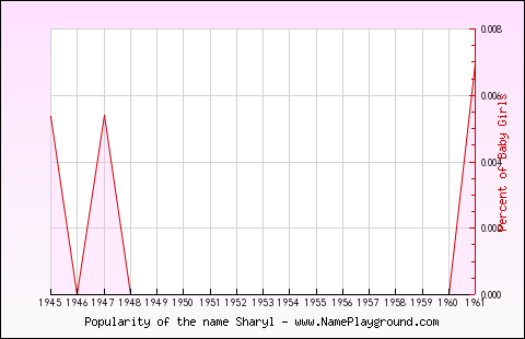 Popularity of the name Sharyl for GirlsFirst Year in the Top 1000: 1945 Last Year in the Top 1000: 1961 Average Age: 72.12 Highest Percentage: 0.007% in 1961 Best Rank: #935 (in 1947) Represented in the Top 1000 names in: 3 of 127 years (2.36%) Total* Female Population in Top 1000: 289 Percentage Of Babies Named SharylNote: Only names in the Top 1000 for each year are represented. [source] Values are normalized for boys and girls to compare trends (vertical scales differ for boys and girls).  Age Distribution of SharylAbout these totals.Female Population under 60: 0 (0.00%) Female Population under 50: 0 (0.00%) Female Population under 40: 0 (0.00%) Female Population under 30: 0 (0.00%) Female Population under 20: 0 (0.00%) Names Similar to SharylSimilar Male Names