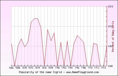 Popularity of the name Sigrid for GirlsFirst Year in the Top 1000: 1886 Last Year in the Top 1000: 1915 Average Age: 123.50 Highest Percentage: 0.012% in 1893 Best Rank: #567 (in 1893) Represented in the Top 1000 names in: 21 of 127 years (16.54%) Total* Female Population in Top 1000: 409 Percentage Of Babies Named SigridNote: Only names in the Top 1000 for each year are represented. [source] Values are normalized for boys and girls to compare trends (vertical scales differ for boys and girls).  Age Distribution of SigridAbout these totals.Female Population under 60: 0 (0.00%) Female Population under 50: 0 (0.00%) Female Population under 40: 0 (0.00%) Female Population under 30: 0 (0.00%) Female Population under 20: 0 (0.00%) Names Similar to SigridSimilar Male Names