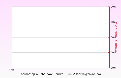 Popularity of the name Tambra for GirlsFirst Year in the Top 1000: 1958 Last Year in the Top 1000: 1958 Average Age: 67.00 Highest Percentage: 0.007% in 1958 Best Rank: #915 (in 1958) Represented in the Top 1000 names in: 1 of 127 years (0.79%) Total* Female Population in Top 1000: 127 Percentage Of Babies Named TambraNote: Only names in the Top 1000 for each year are represented. [source] Values are normalized for boys and girls to compare trends (vertical scales differ for boys and girls).  Age Distribution of TambraAbout these totals.Female Population under 60: 0 (0.00%) Female Population under 50: 0 (0.00%) Female Population under 40: 0 (0.00%) Female Population under 30: 0 (0.00%) Female Population under 20: 0 (0.00%) Names Similar to TambraSimilar Male Names