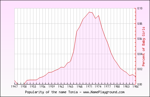 Popularity of the name Tonia for GirlsFirst Year in the Top 1000: 1947 Last Year in the Top 1000: 1986 Average Age: 54.76 Highest Percentage: 0.095% in 1971 Best Rank: #212 (in 1971) Represented in the Top 1000 names in: 37 of 127 years (29.13%) Total* Female Population in Top 1000: 20032 Percentage Of Babies Named ToniaNote: Only names in the Top 1000 for each year are represented. [source] Values are normalized for boys and girls to compare trends (vertical scales differ for boys and girls).  Age Distribution of ToniaAbout these totals.Female Population under 60: 16340 (81.57%) Female Population under 50: 5223 (26.07%) Female Population under 40: 342 (1.71%) Female Population under 30: 0 (0.00%) Female Population under 20: 0 (0.00%) Names Similar to ToniaSimilar Male Names