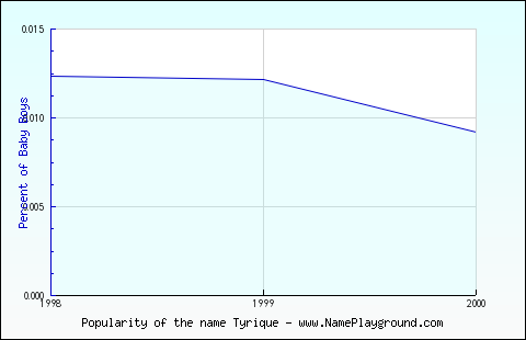 Percentage Of Babies Named TyriqueNote: Only names in the Top 1000 for each year are represented. [source] Values are normalized for boys and girls to compare trends (vertical scales differ for boys and girls).  Age Distribution of TyriqueAbout these totals.Male Population under 60: 579 (100.00%) Male Population under 50: 579 (100.00%) Male Population under 40: 579 (100.00%) Male Population under 30: 579 (100.00%) Male Population under 20: 0 (0.00%) Male Population under 10: 0 (0.00%) Names Similar to TyriqueSimilar Male Names