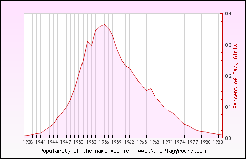 Popularity of the name Vickie for GirlsFirst Year in the Top 1000: 1937 Last Year in the Top 1000: 1984 Average Age: 66.76 Highest Percentage: 0.366% in 1956 Represented in the Top 1000 names in: 48 of 127 years (37.80%) Total* Female Population in Top 1000: 107878 Percentage Of Babies Named VickieNote: Only names in the Top 1000 for each year are represented. [source] Values are normalized for boys and girls to compare trends (vertical scales differ for boys and girls).  Age Distribution of VickieAbout these totals.Female Population under 60: 20442 (18.95%) Female Population under 50: 3178 (2.95%) Female Population under 40: 0 (0.00%) Female Population under 30: 0 (0.00%) Female Population under 20: 0 (0.00%) Names Similar to VickieSimilar Male Names